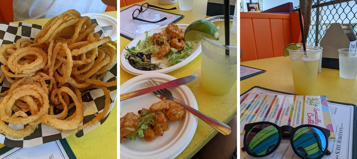 Ahhhhhh.....summer = Lazy Jack's. Casual, outdoor sea breezes by the Piscatiqua, great drinks (although those who enjoy salt on their margarita need to keep in mind that regular drinks come in plastic cups and therefore salt doesn't really stick!), and fantastic apps and food. This time, we had a couple of apps: onion rings were skinny crispy and fantastic, huge portion. Bang bang shrimp is always a hit. And hubby ordered a "Lazy Dilla" (quesadilla), with lobster and cheese (He says he probably would have added some sort of sauce or salsa on that to give it some zing, but people who love lobster would probably really enjoy it as is). The service is amazing and friendly. The prices are reasonable and the atmosphere is fun and festive and beautiful by the water! Highly recommend for a casual time in Portsmouth. But come early! Tables fill up fast.